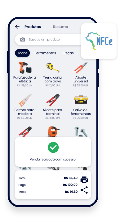 Criando a conta com seu CNPJ, você pode adicionar seu certificado digital e emitir NFC-e facilmente direto do sistema, sem necessidade de contratar um sistema adicional. Além disso, você pode emitir NF-e com NFC-e de venda referenciada direto pelo sistema.